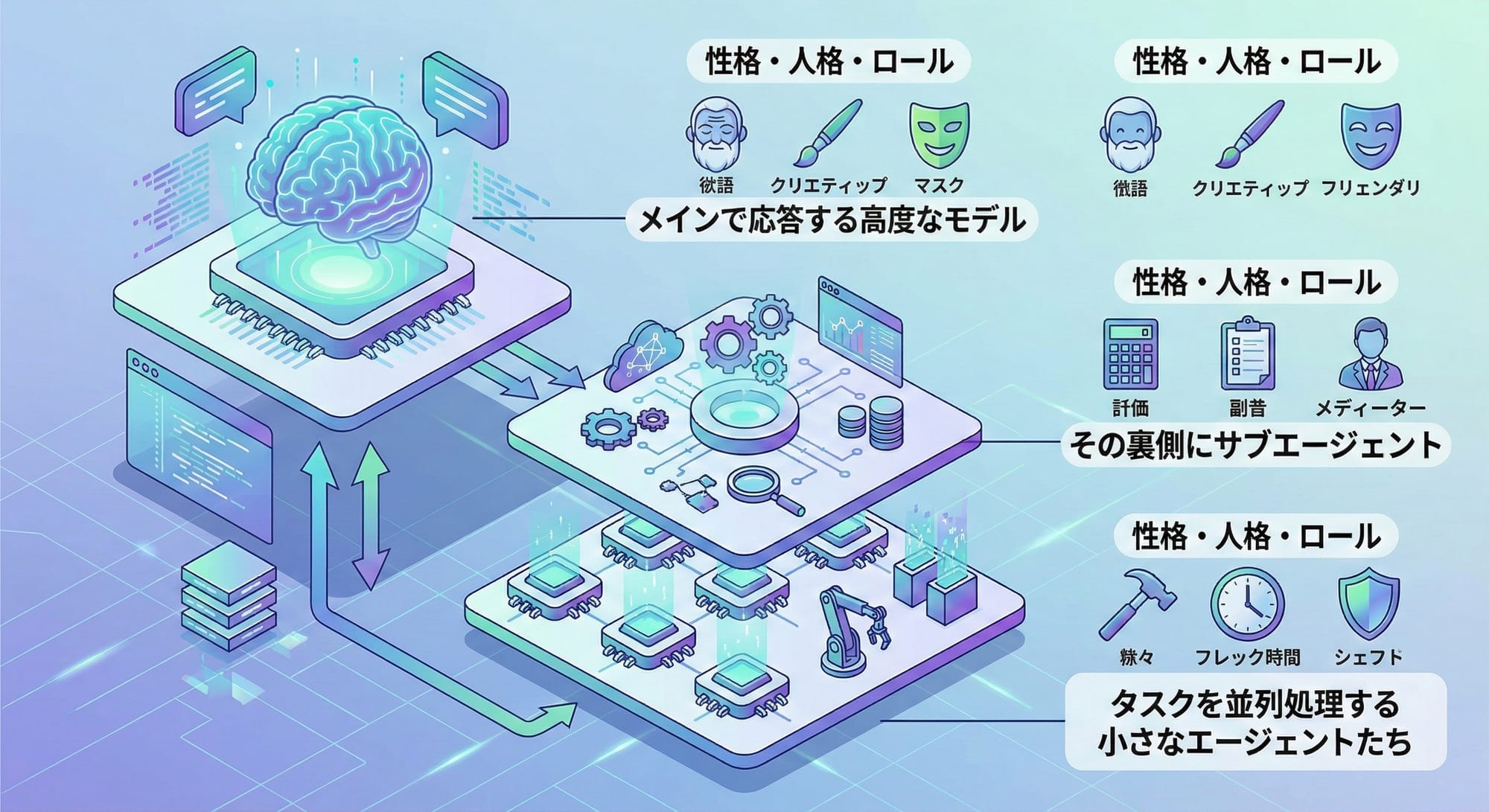 メインで応答する高度なモデルがいて、その裏側にサブエージェントがいる。さらにタスクを並列処理する小さなエージェントたちがいる。